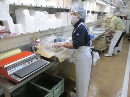 衛生面を施した中で、ちりめんじゃこ、明太子などの魚介類と精肉に分かれて作業を。