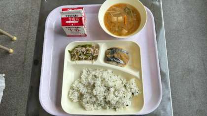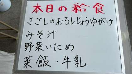 今日の給食は、さごしのおろし醤油かけ、味噌汁、野菜炒めです。ご飯は菜飯です。