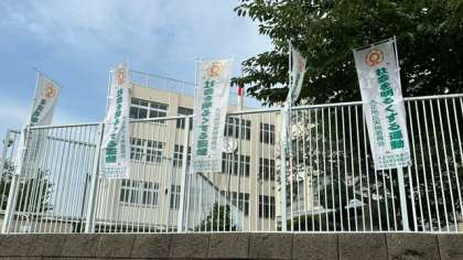 学校の門前、千島3の交差点柵に「社会を明るくする運動」ののぼりを掲げています。