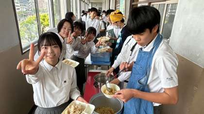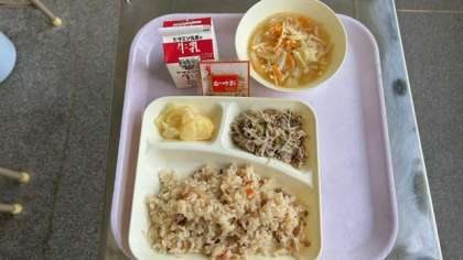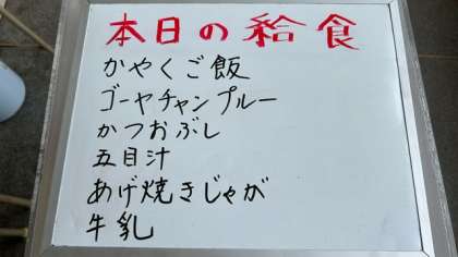 今日の給食は、ゴーヤチャンプル(鰹節)、五目汁、あげ焼きじゃがです。ご飯はかやくご飯です。