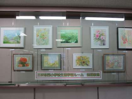 区役所2階のギャラリー。三軒家西小学校生涯学習ルームに所属する皆様方の、秋にふさわしい絵画が展示されています。
