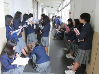 見てください! 3年生は廊下で待っている間も、勉強しています!