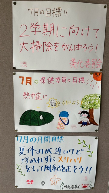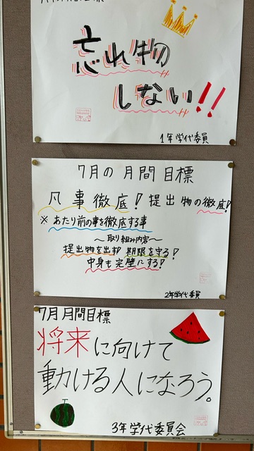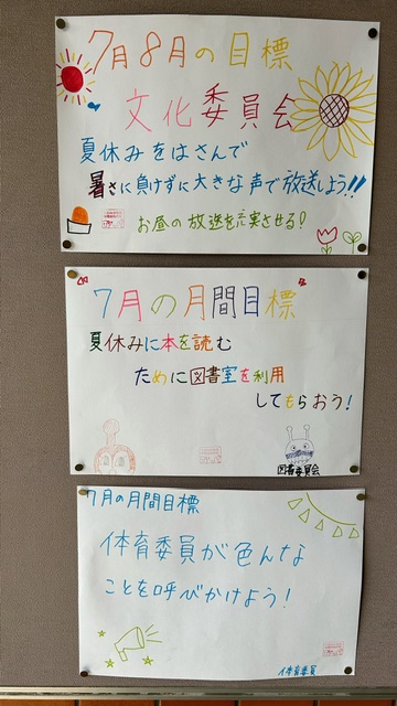 各委員会のポスターができあがりました。7月はあと2週間です。残りの学校生活を有意義に過ごすようにしましょう。