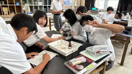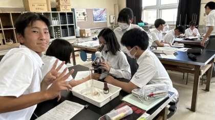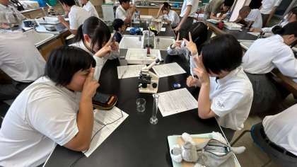 うまく化合できれば、無色透明になるはずですが、乳白色になっている班もあります。大丈夫?できた溶液を加熱して顕微鏡で見ると、綺麗な結晶が見られました^_^