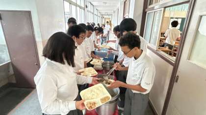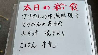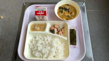 今日の給食は、鮭の醤油風味焼き、味噌汁、冬瓜の煮物です。焼き海苔がついています。