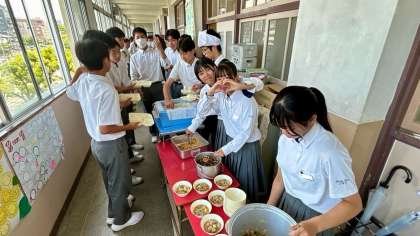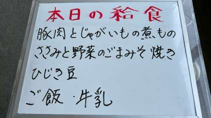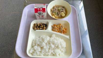 今日の給食は、豚肉とじゃがいもの煮物、ひじき豆、ささみと野菜のごま味噌焼きです。