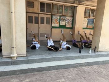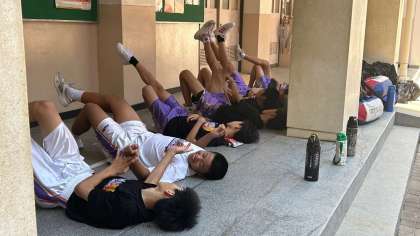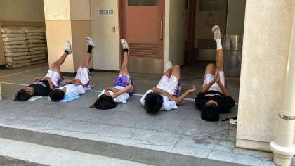 校舎1階にて、男子バスケットボール部が基礎トレーニング中です。
