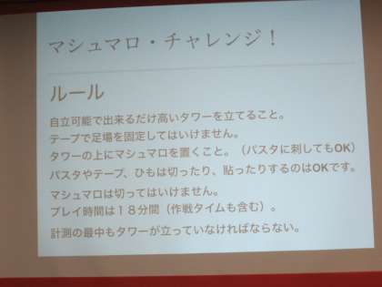 続いて「マシュマロチャレンジ」。パスタやマシュマロを使って、タワーを作ります。