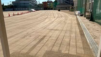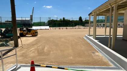 体育館建替え工事で、重機やトラックの出入りしていた運動場北側が、綺麗に整地されています。