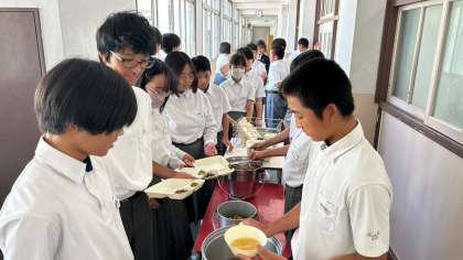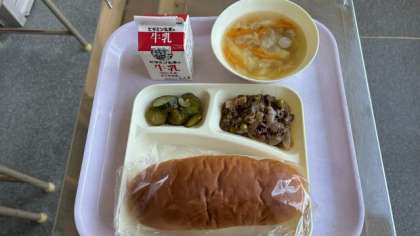 今日の給食は、牛肉のソース煮、スープ、きゅうりのピクルスです。パンは黒糖パンです。