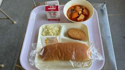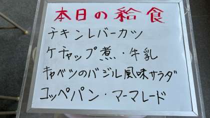 今日の給食は、チキンレバーカツ、ケチャップ煮、キャベツのバジル風味サラダです。パンにはアプリコットジャムがついています。