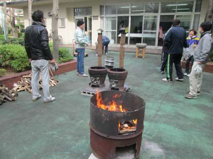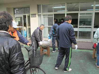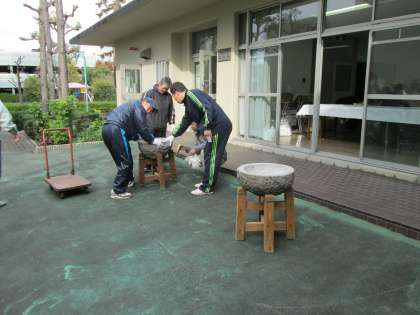 本日、学校のすぐ近く、北恩加島地域のマンションで、12月恒例の餅つき大会が開催されています。