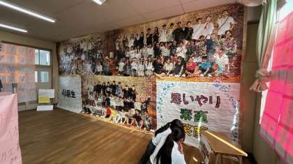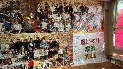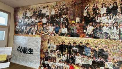 教室の後ろには、後ろの壁いっぱいにモザイクが貼られていました。46期生一人一人が書き込んだ875枚のモザイク画をつなぎ合わせています。