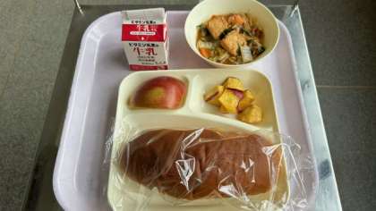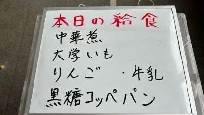 今日の給食は、中華煮、大学芋、りんごです。パンは黒糖パンです。
