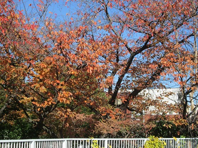 冬の日差しに輝く、桜ともみじ。来年は、モミジが赤くなりますように。