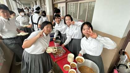 3年生の教室の前では、給食を配膳していますが、係の生徒が上手に配ってくれています。写真写りもいいですねー^_^