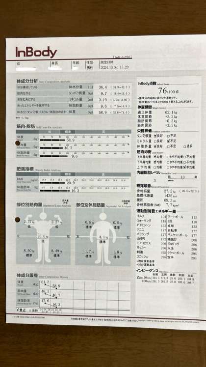 筋肉量と体脂肪などが分かります。体成分の評価をもとに点数がつけられ、80点以上が目標だそうです。皆さん結果どうでしたか?