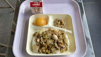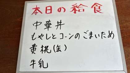 今日の給食は、中華丼、もやしとコーンの胡麻炒め、黄桃(缶)です。