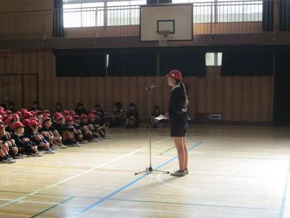 まずは、全員が集まって、生徒会会長からのあいさつです。