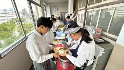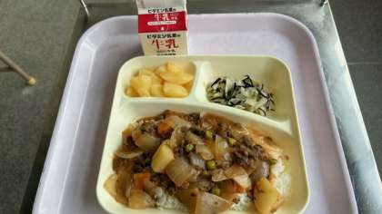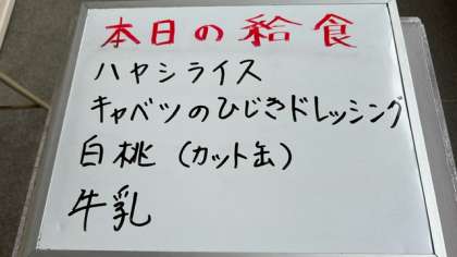 今日の給食は、ハヤシライス、キャベツのひじきドレッシング、白桃(カット缶)です。