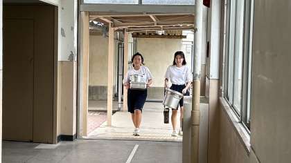 給食を食べ終わり、係の生徒が空になった食缶を運んでくれています。午後からは体育大会全体練習ですね。頑張ってね^_^