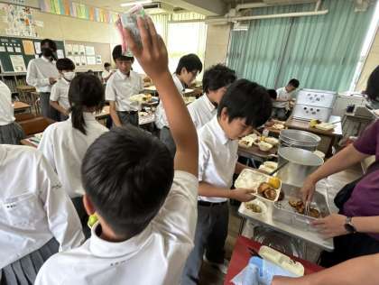 今日の給食は、味噌カツ、じゃがいもと野菜の煮物、みかん、ソフト黒豆です。