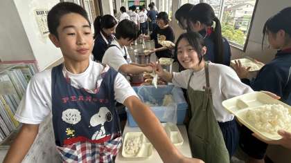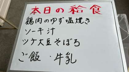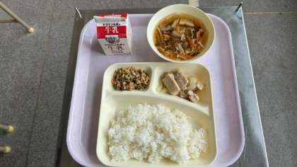 今日の給食は、鶏肉のゆず塩焼き、ソーキ汁、ツナ大豆そぼろです。