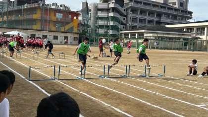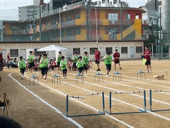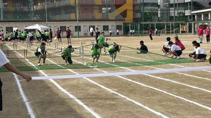 おたまに卓球玉を乗せ、瓶の中に。ハードルを飛び越え、最後はネットくぐります。