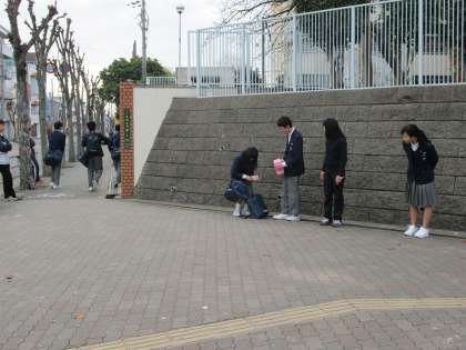 正門前で、登校生徒はもとより、通勤の皆様にも呼びかけています。