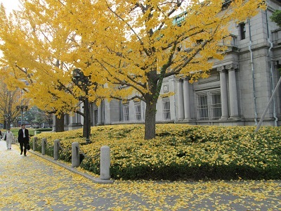 昼間は、街路樹の銀杏が輝いていましたが、かなり散って植え込みが黄色のじゅうたんに・・・。いよいよ冬本番です。
