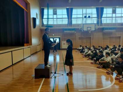 10月19日(土)、中央公会堂で開催された大阪市中学校総合文化祭で表彰された演劇部の伝達を全校集会で行いました。