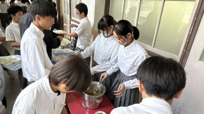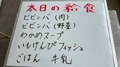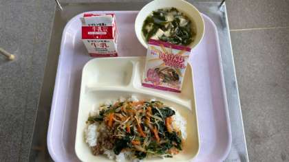 今日の給食は、ビビンバ、わかめスープ、芋けんぴフィッシュです。
