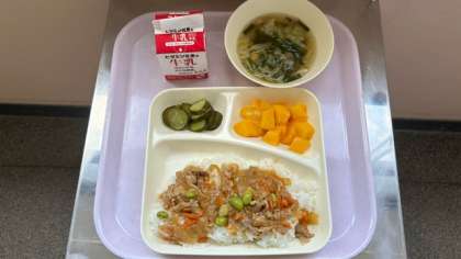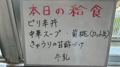今日の給食は、ピリ辛丼、中華スープ、きゅうりの甘酢漬け、黄桃(カット缶)です。