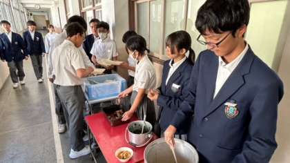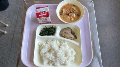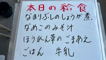 今日の給食は、なまりぶしの生姜煮、なめこの味噌汁、ほうれん草のごま和えです。