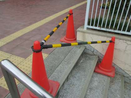 正門の、玄関ピロティ—に上がる階段のタイルを補修しています。
