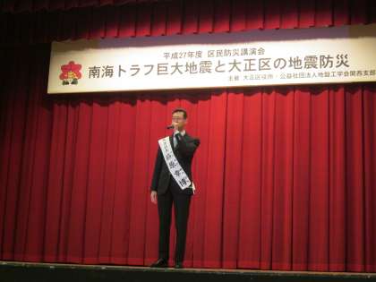 筋原区長様からご挨拶があり、南海トラフが起こった場合、117分で大正区に津波が押し寄せる、6.6m以上の高さに避難しなければならないことを教えていただきました。