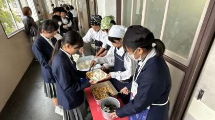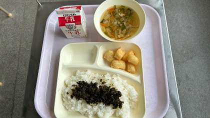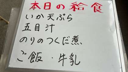 今日の給食は、イカ天ぷら、五目汁、海苔の佃煮です。