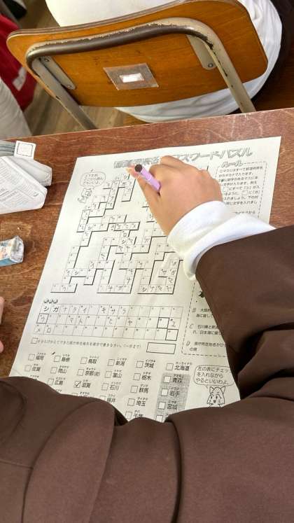 このクラスでは、社会科の授業でヒントをもとに、クロスワードを完成させています。