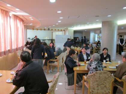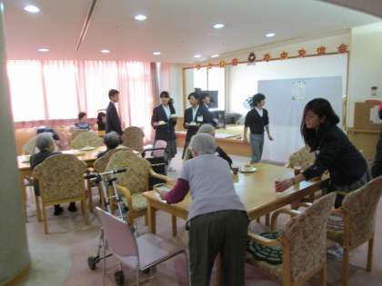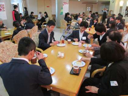 お年寄りとのティータイム。いろいろとおしゃべりに花が咲きました。年齢差があっても、優しい気持ちは自然とわいてきます。