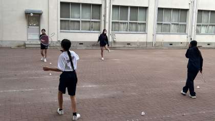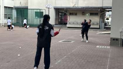 体育館は順番に部活動をしているので、バドミントン部はまずは中庭で活動しています。後ほど体育館に入れるそうです。