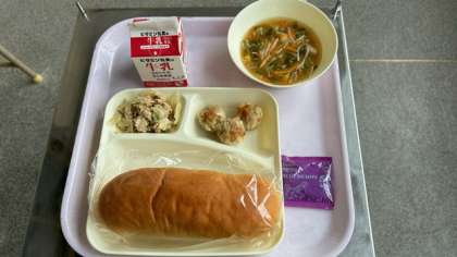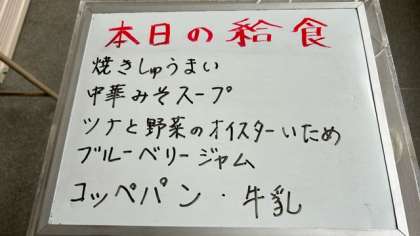 今日の給食は、焼売、中華味噌スープ、ツナと野菜のオイスター炒めです。パンにはブルーベリージャムがついています。