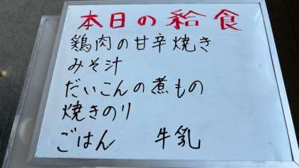今日の給食は、鶏肉の甘辛焼き、味噌汁、大根の煮物です。焼き海苔が付いています。