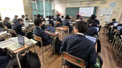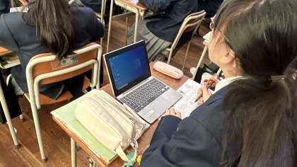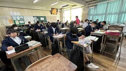 家庭科では、衣服についているタグから、サイズや洗濯の注意点を読み取る授業を行っています。