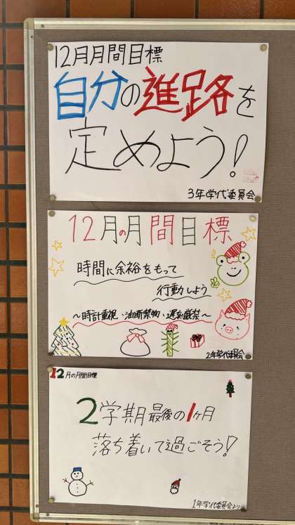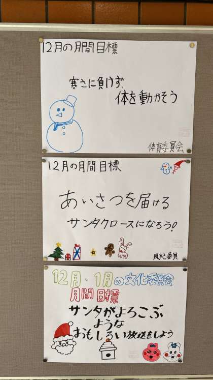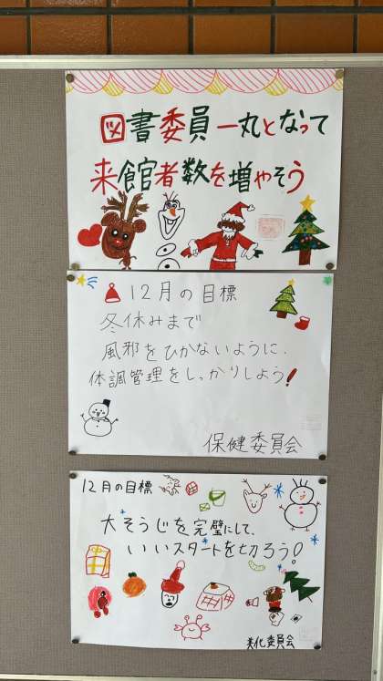 正面玄関の掲示板に、各委員会の12月の目標がポスターとして掲示されています。