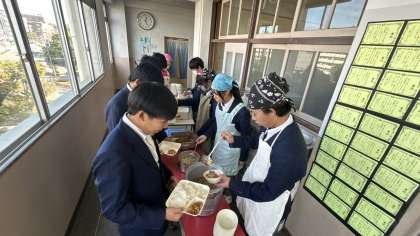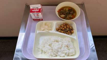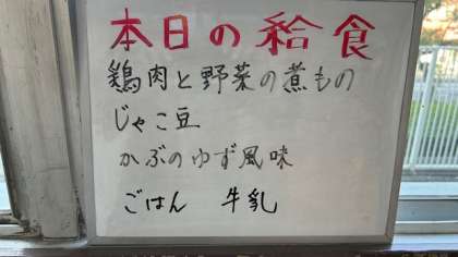今日の給食は、鶏肉と野菜の煮物、じゃこ豆、かぶのゆず風味です。