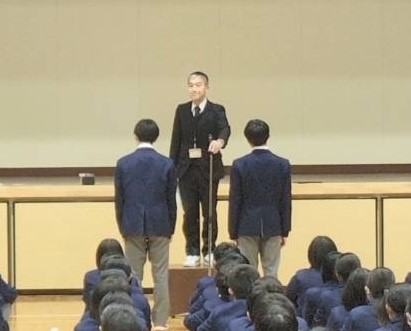 まず、冬休みに行われた大会で、バレーボールの大会に大阪府代表で出場した2名の生徒を表彰伝達しました。全国大会で準優勝!素晴らしい!