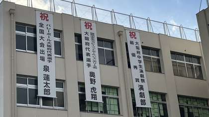 先日まで2枚の懸垂幕を掲げていましたが、今回演劇部が大阪府の演劇祭にて「大阪知事賞」を受賞しました。