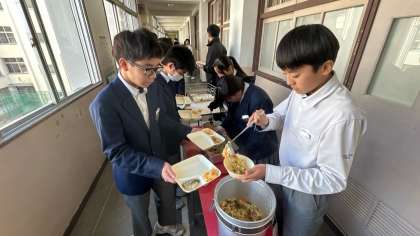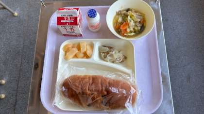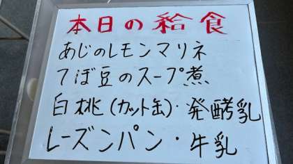 今日の給食は、鯵のレモンマリネ、てぼ豆のスープ煮、白桃(カット缶)です。パンはレーズンパンです。発酵乳がついています。