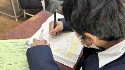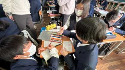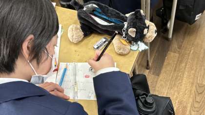 皆さん上手に英文ができていますね。その横にはその英文が表す絵を色鉛筆できれいに書いています。