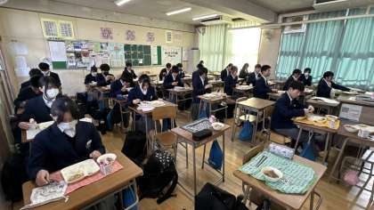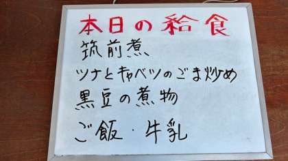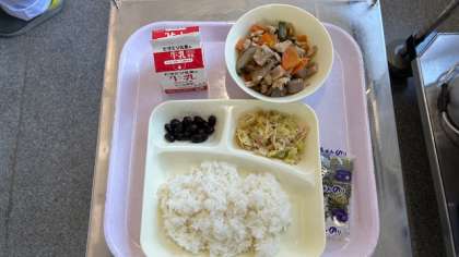 今日の給食は、筑前煮、ツナとキャベツの胡麻炒め、黒豆の煮物です。